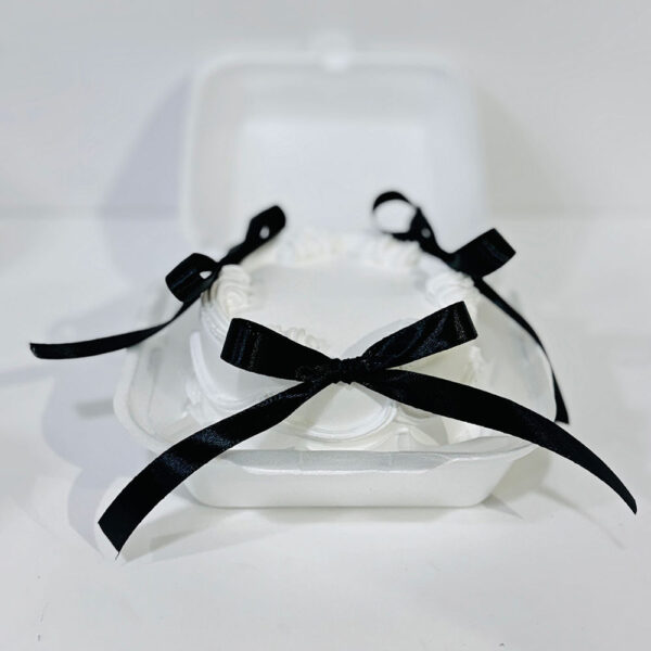 A chocolate bento or lunch box cake featuring rich, moist layers of chocolate crust and smooth white frosting, elegantly decorated with a black ribbon. Its compact size and refined design make it a sophisticated treat.