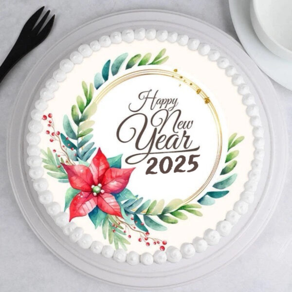 Celebrate the New Year with a delicious photo cake featuring layers of vanilla, red velvet, and chocolate. Perfectly frosted and decorated with festive accents, it’s a sweet and vibrant way to welcome 2025!